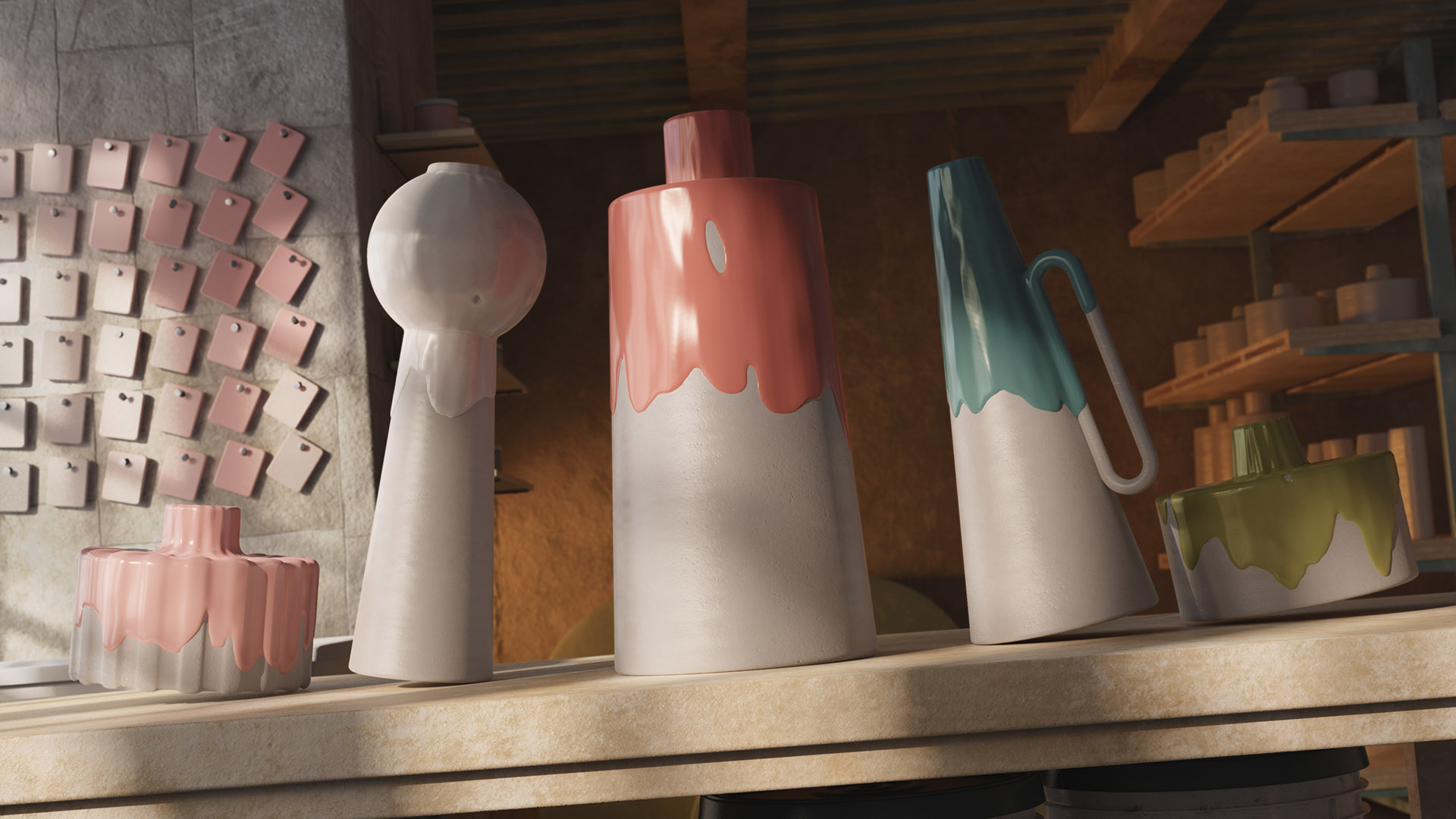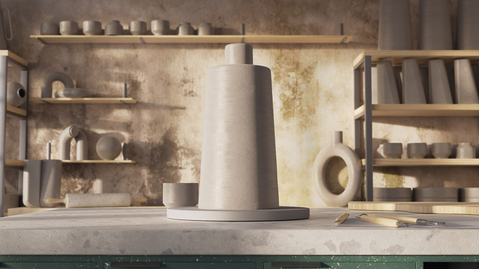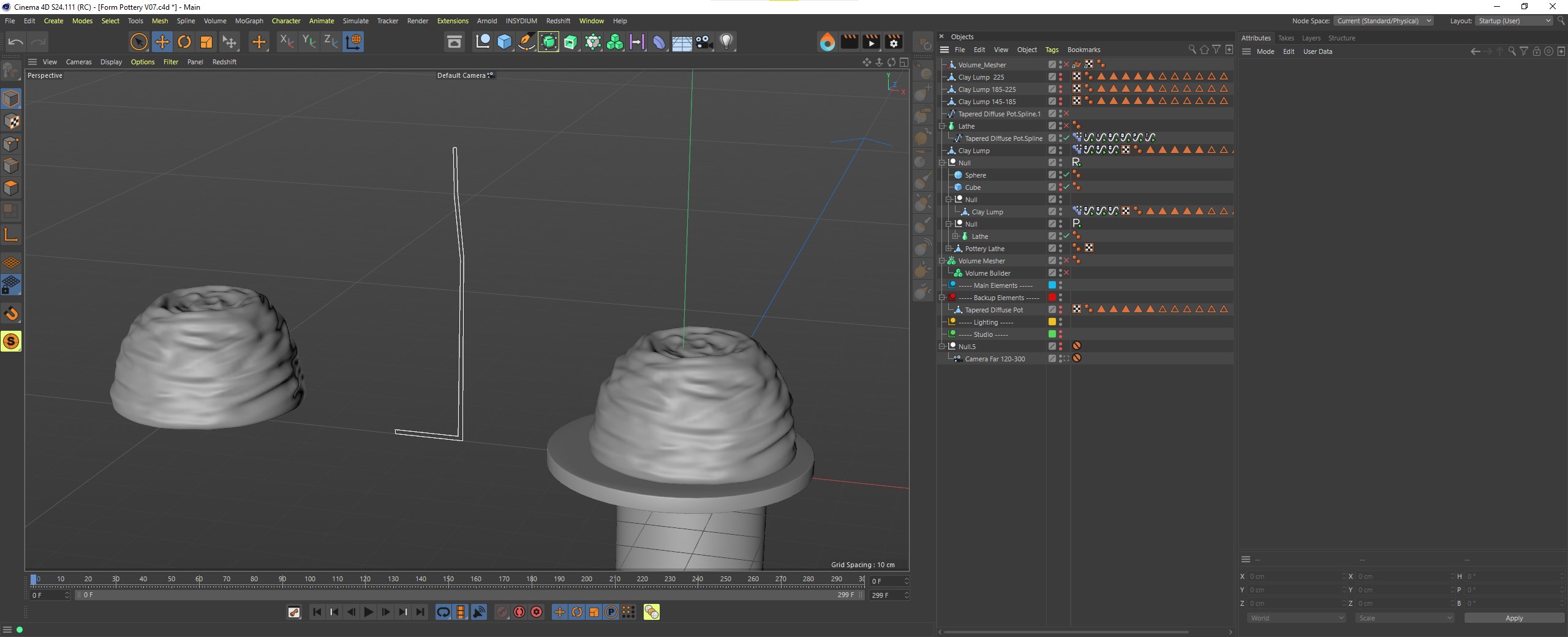 Instead, I used an animated spline to snap the pot into different shapes and had it rise from underneath the lump of clay. The lump itself was an animated point-morph mesh to give the illusion that the clay was being shaped. Then I combined both meshes into an OVDB mesher and baked the textures along with it.
