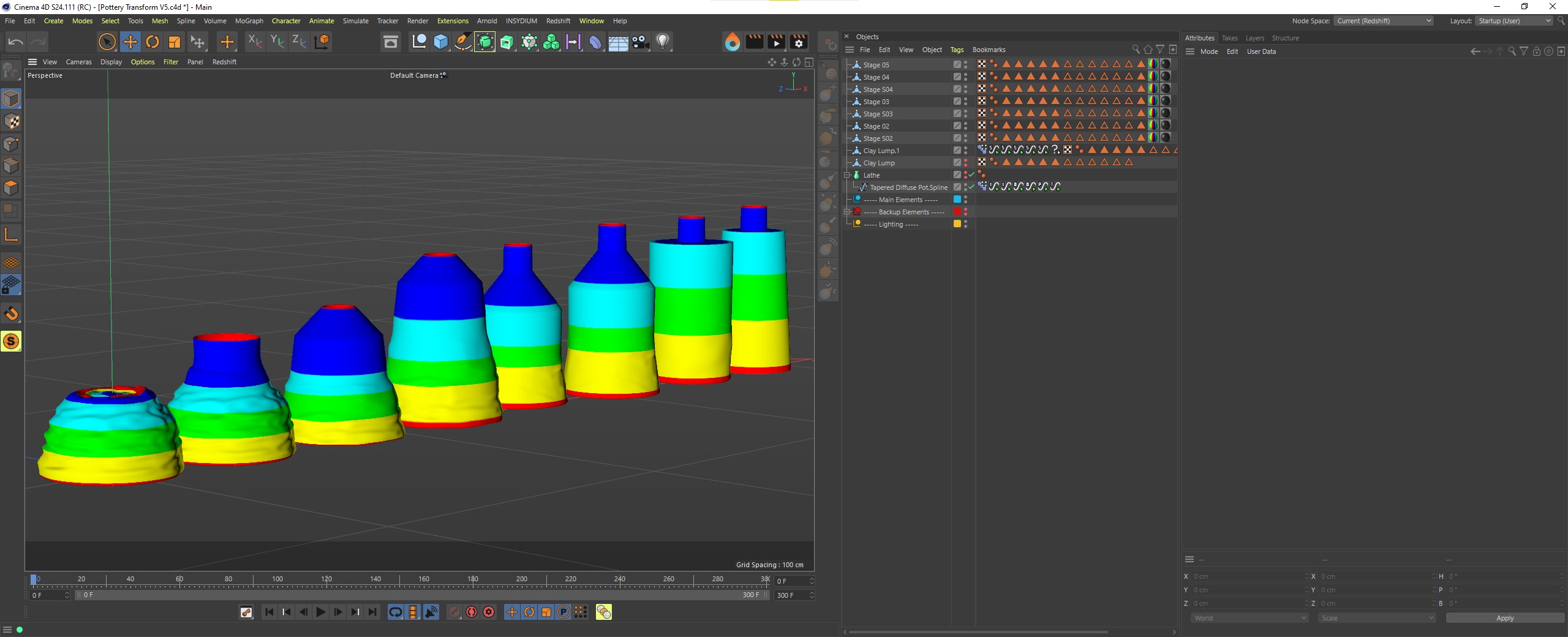 To make the pottery in the first shot, I started by creating the first and final stages of each piece. My first thought was to animate each state individually and blend them together, as can be seen in the image with the rainbow. The UVs needed to stay in the same positions as it grew so I used the gradient to help track the parameter. Unfortunately, using this method didn't allow me to animate on specific beats the way I hoped, so I ended up scrapping that process.